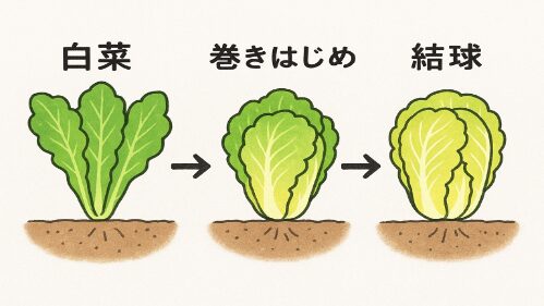白菜の「結球(けっきゅう)」とは、中心の葉が重なり合って、丸く玉のように巻く状態のことです。