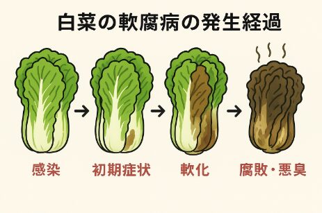 - 病原菌の侵入: 土壌中に広く生息する病原菌が、害虫の食害痕や管理作業でついた傷口から白菜の内部に侵入する
