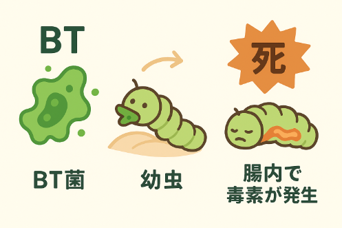 植物に付着したBT菌を害虫の幼虫が食べると、腸内で毒素が発生して、死滅するという仕組みです。